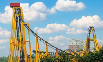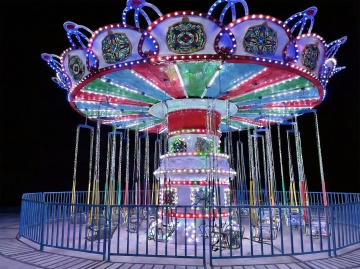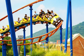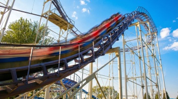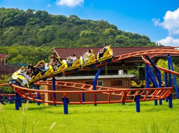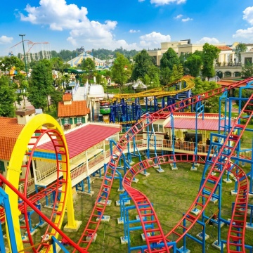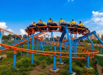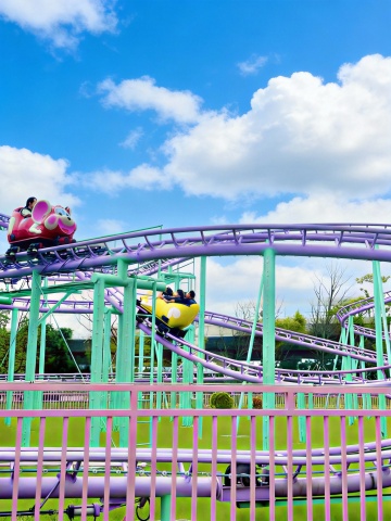 3D卡通风格,可爱的三花猫咪作为主角,在色彩鲜艳明亮的游乐场中,和一群不同颜色的猫咪们一起乘坐过山车,过山车轨道蜿蜒曲折,背景有旋转木马和摩天轮,猫咪们表情兴奋,画面充满欢乐氛围,高饱和度色彩,细节丰富,光线明亮