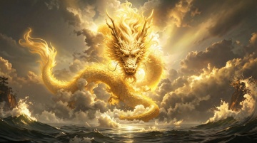 鎏金巨龙腾云而起,3D重拟物风格尽显金属质感与体积感,光影交错中透出神圣与奢华,虚拟自然背景烘托东方神韵。