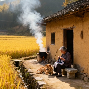 背景是层峦叠嶂的青绿色山脉,山间薄雾缭绕,远处田野呈现柔和的色块,阳光透过枝叶洒下斑驳的光影,整体色调温暖清新,画面充满丰收的治愈感