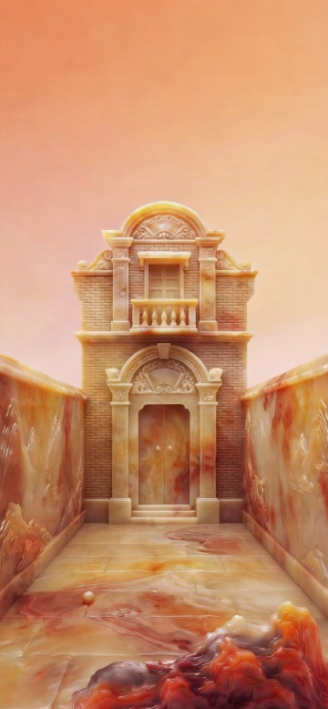 粉色拱门与玫瑰,云端背景,梦幻浪漫,软3D风简约设计。