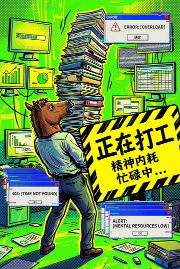 卡通感插画风,拟人化马儿办公,幽默表达职场压力。