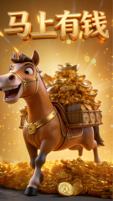 3D拟人马背负金元宝,鎏金金属风十足,喜庆卡通感爆棚,寓意“马上有钱”,节日氛围浓厚。