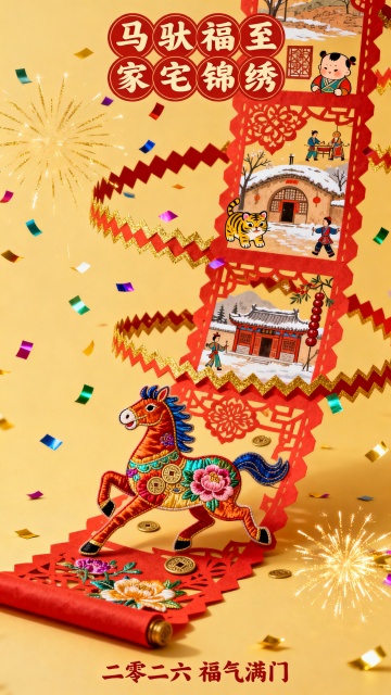 红金配色,3D立体剪纸风马年贺图,融合撕纸与浮雕质感,中式元素满溢,喜庆吉祥,寓意马年大吉。