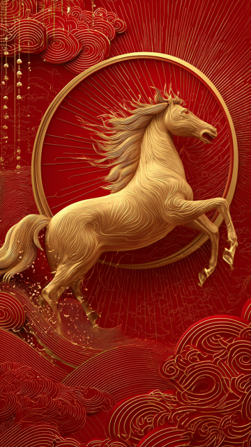 鎏金浮雕骏马跃动于红金祥云间,融合国潮风与古典纹样,金属质感尽显奢华喜庆,传递中式节日祝福。