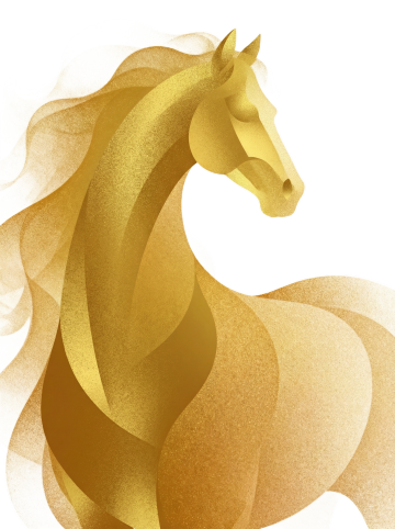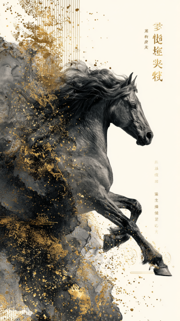 鎏金风与水墨风交织,黑骏马腾跃于几何线条与抽象粒子间,融合国潮风与未来感,展现古典与科技的双重曝光美学。