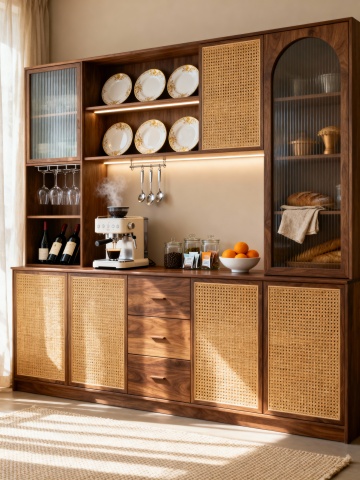 全景构图,极简主义开放式厨房,60%留白空间由灰调水泥墙面与悬浮式浅木色置物架构成,中央岛台以哑光白人造石打造,台面仅点缀三件器物:半透明玻璃水壶盛着薄荷冰块、单只哑光白陶瓷碗卧着两颗牛油果、拉丝黄铜调味罐静立角落。阳光透过整面落地窗形成水平光带,在台面上切割出明暗几何,右侧嵌入式家电区域以黑色线条勾勒轮廓,不锈钢烟机与墙面形成垂直视觉引导。整体色调采用莫兰迪色系的灰白基底,局部以牛油果绿与黄铜色作为情绪点缀,材质表现聚焦于石材的细腻肌理与金属的柔和反光,营造出克制而富有呼吸感的当代生活场景。