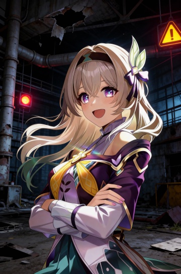 日系动漫风格插画,画面整体采用暖橙色与淡紫色渐变为主色调,柔和的午后阳光从侧上方照射,形成明亮的高光和细腻的阴影,光线通透感强,空气感十足。前景中,一位身着白色镶金边水手服外套、灰色格纹百褶裙的少女,她有着一头及腰的渐变粉紫色长卷发,发尾微微内扣,头顶戴着一个带有珍珠装饰的发箍,刘海呈自然的空气感波浪状。少女正侧身站立,双手自然交叠放在身前,身体微微前倾,面带温柔的微笑,双眼是清澈的橙紫色渐变眼眸,眼神明亮有神。她的绿色格纹领巾系成蝴蝶结状,胸前别着一个金色徽章。背景是开满粉色和白色花朵的公园小径,远处有波光粼粼的湖面和朦胧的绿色树木,整体构图采用三分法,少女位于画面中央偏左位置,背景元素层次分明,营造出温馨浪漫的氛围,画面细节丰富,线条流畅,色彩过渡自然,具有强烈的插画艺术感和视觉吸引力。
