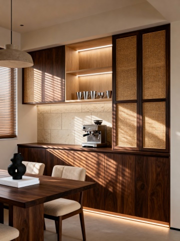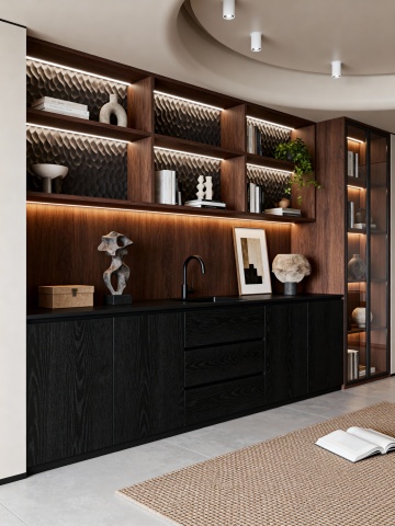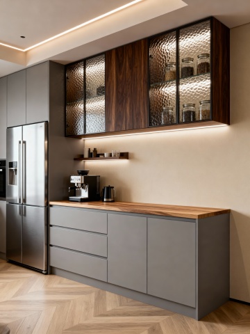 现代简约风格厨房内部场景,整体保持原图厨房样式布局,灰色大理石台面搭配白色与深灰色组合橱柜,黑色大理石纹理 backsplash 后墙,台面左侧放置黑色碗碟内有红黄梨子和苹果,背景操作台摆放绿色盆栽、木质砧板、白色花瓶及各类厨房小家电,嵌入式条形暖光照明从橱柜底部投射营造温馨氛围,光线柔和自然,空间层次分明,材质细节清晰,具有北欧极简设计感。