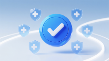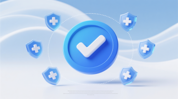 科技感十足的软3D盾牌图标,蓝白配色搭配透明环绕带,玻璃质感与清透光影交织,未来感设计展现安全验证主题。