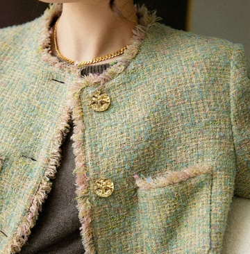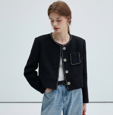 优雅复古风小香风套装,融合刺绣细节与简约剪裁,面料质感细腻,搭配珍珠项链与黑色手袋,尽显时尚商务气质。