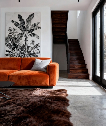 俯视角构图,在一个极简工业风客厅的几何中心,深灰色模块化布艺沙发呈不规则多边形展开,六个炭黑色皮质靠垫随意散落其上,沙发前悬浮着三个由粗砺混凝土浇筑的六边形矮几,几面上随意放置着两个黄铜材质的几何花瓶,里面插着干枯的尤加利枝。右侧墙面悬挂着一幅由生锈铁板切割而成的抽象艺术装置,与墙面裸露的红砖肌理形成材质对话。左侧整面墙是未经修饰的混凝土材质,仅在中央位置嵌入一扇黑色金属框架的窄高窗,冷冽的午后阳光透过窗棂在深灰色水泥地面投射出锐利的几何阴影。天花板悬挂着三盏黑色金属骨架的工业吊灯,灯泡外包裹着铁丝网罩。空间角落立着一盆高大的琴叶榕,栽在粗陶素坯花盆中。地面铺设着深灰色水磨石,表面保留着细微的金属骨料闪光。整个空间呈现出粗犷材质与精致几何的矛盾统一,色调以水泥灰、炭黑和铁锈红为主,营造出冷静克制却不失温度的都市工业美学。