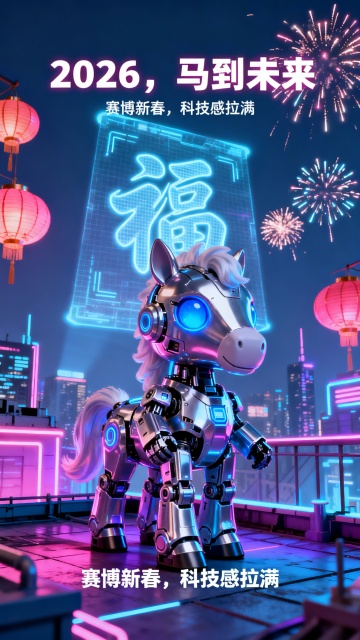 赛博朋克风3D机械马,霓虹灯辉映,金属质感十足,融合传统灯笼与虚拟现实“福”字,喜庆科技感爆棚,迎接2026未来新春。