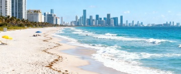 高清摄影风格的海滩风景,细腻真实的质感,画面下方是大面积金黄色的沙滩,沙子纹理清晰可见,有自然形成的波浪状起伏和细微的颗粒感。中景是浅蓝色的海水,海浪轻轻拍打沙滩,形成白色的浪花边缘,海水呈现出由浅至深的渐变蓝色。远景是广阔的海平面,与上方的天空相接。天空占据画面上半部分,是明亮的蔚蓝色,点缀着几朵形态自然、边缘柔和的白色积云,云层分布稀疏,阳光透过云层洒下,光线明亮柔和,整体画面充满清新、宁静、开阔的氛围。左上角有几片绿色的棕榈叶斜向伸出,叶片脉络清晰,色彩鲜亮,为画面增添了一抹自然的生机,整体构图采用三分法,沙滩、海水、天空层次分明,视觉引导线自然,色彩和谐统一,给人以放松、惬意的度假感。