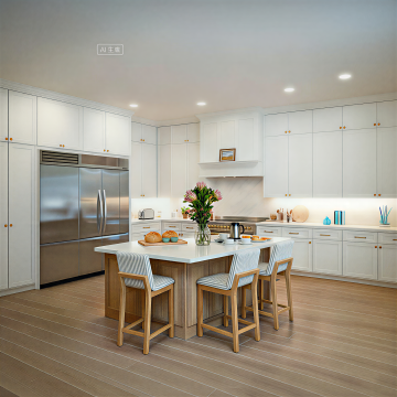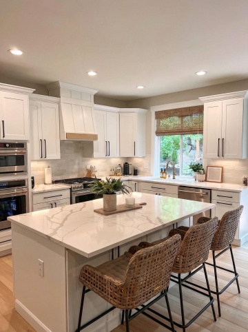 一个明亮整洁的现代厨房,采用简约优雅的设计风格,以白色为主色调,搭配黄铜色金属装饰细节。厨房整体呈现出温馨舒适的氛围,阳光透过百叶窗洒入,在白色橱柜和大理石台面上形成柔和的光影效果。白色的橱柜带有黄铜色的圆形拉手,上方的吊柜和下方的地柜组合提供了充足的储物空间。大理石台面光滑洁净,带有自然的灰色纹理。台面上有一个双槽不锈钢水槽,搭配黄铜色的水龙头。水槽旁边的金属桶里插着木质的锅铲和汤勺。墙面安装着黄铜色的挂杆,上面挂着各种木质和金属材质的厨房用具,包括勺子、铲子等。挂杆上方的白色搁板上摆放着不锈钢和玻璃材质的储物罐,里面装着各种香料和食材。台面上还摆放着一个白色的盘子,里面放着几块叠在一起的三明治,旁边还有一盘色彩鲜艳的沙拉。整体构图采用了三分法,光线从左侧窗户进入,营造出明亮通透的感觉,细节丰富,质感细腻,展现出干净利落的现代厨房设计感。