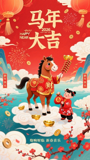 国潮风插画,红马奔腾于祥云之间,融合水墨与鎏金元素,配以红灯笼与鞭炮,尽显中式喜庆与民族韵味,贺马年新春大吉。