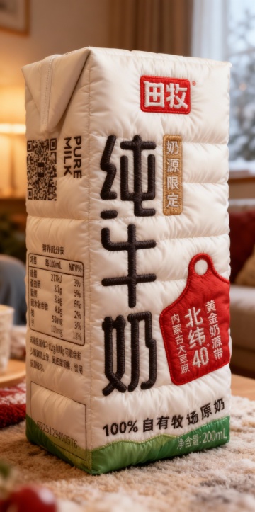 刺绣风与重拟物结合,面料质感营造质朴温馨感,简约主义设计突出纯牛奶的天然本真,节日氛围中传递舒适与安心。