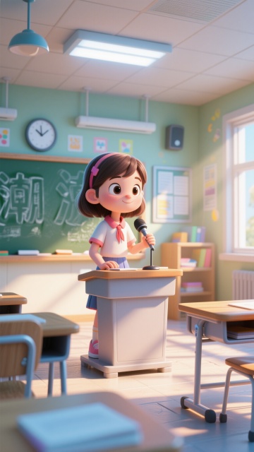 3D卡通风格,拟人化教师手捧鲜花,简约教室背景,清新感十足,庆祝教师节。