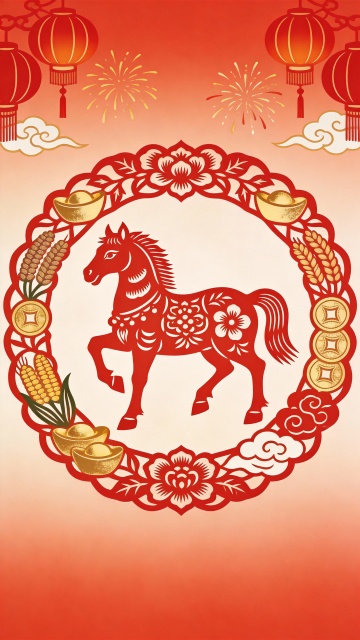 剪纸风国潮插画,红金配色彰显喜庆与中式韵味,马年主题融合祥云、灯笼与丰收元素。