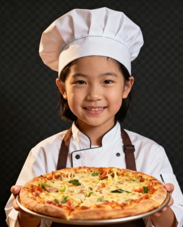 3D风重拟物摄影,实景感厨房中童趣小厨师微笑料理,清新蔬果环绕,温馨可爱,柔和光影营造舒适氛围。