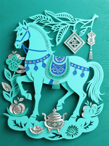剪纸风融合国潮元素,青绿马身配银蓝纹饰,浮雕质感十足,点缀祥云、灯笼与香炉,尽显中式喜庆与民族韵味。