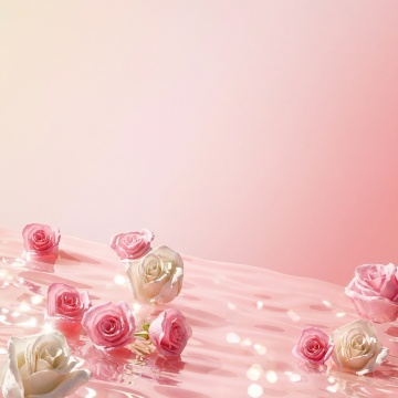 一束娇艳欲滴的粉白色玫瑰花丛特写,每朵玫瑰花瓣层层叠叠,边缘微微卷曲,表面覆盖着晶莹剔透的水珠,水珠在花瓣上折射出闪亮的光泽,背景中玫瑰花影朦胧,整体呈现出柔和的浅粉色与白色渐变色调,光影柔和,营造出浪漫清新的氛围,花瓣质感细腻柔软,绿色花萼点缀其间,构图饱满,细节丰富,具有高度写实的摄影风格。