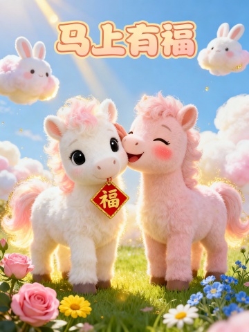软3D风卡通小马,毛发生长质感细腻,梦幻粒子飘散,温馨喜庆氛围中传递“马上有福”祝福,充满可爱与节日欢愉。