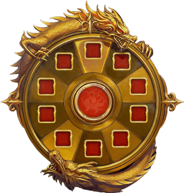 插画风国潮设计,鎏金龙纹盾牌,火焰环绕,尽显神圣与威严。