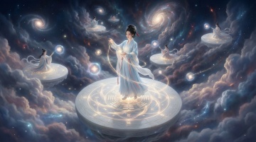 梦幻唯美的中式插画风,古典仙人触月,云海缭绕,超现实主义意境。