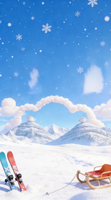插画风与3D结合,呈现梦幻雪景中的滑雪乐园,光影交错,人物生动,营造清新舒适氛围,虚拟现实感十足。