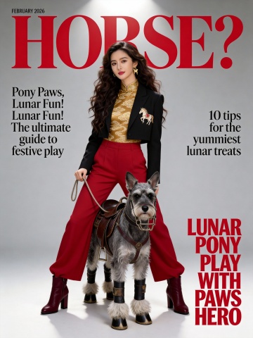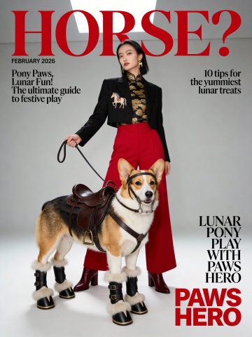 国潮风与拟人风碰撞,皮影元素融入时尚造型,狗狗化身“马”演绎潮流喜庆。杂志风封面融合印刷感排版,展现新春趣味与时尚张力。