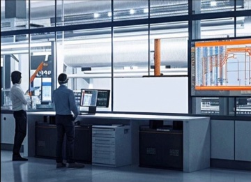 现代化工业场景,蓝色为主色调,清新明亮的光线,干净整洁的生产线,透明玻璃幕墙外是蓝天白云,绿色植物点缀在车间角落,机械臂精准运作,地面反光如镜,整体氛围充满科技感与希望