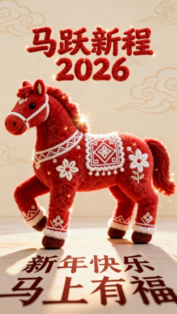 软3D毛绒马形象,融合国潮刺绣元素,喜庆红白配色,毛发生长质感,卡通可爱风,传递2026新年祝福。