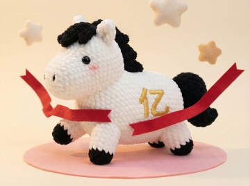 “亿马当先”软3D毛绒马,融合刺绣风红绸飘带,萌趣卡通造型,点缀毛发生长感星星,喜庆可爱,节日氛围浓郁。