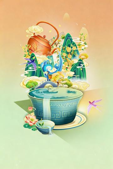 中式古典插画风,国潮元素融入虚拟自然景观,展现山水和谐之美。