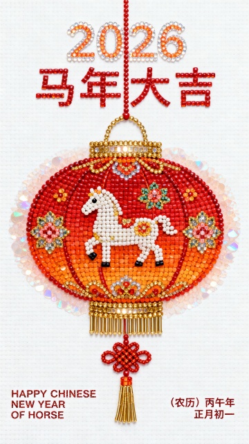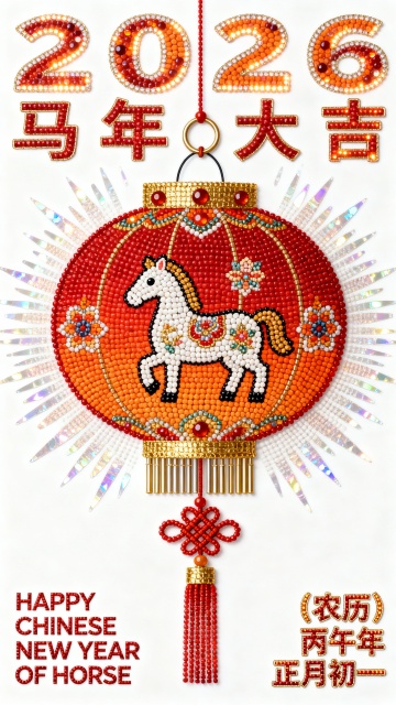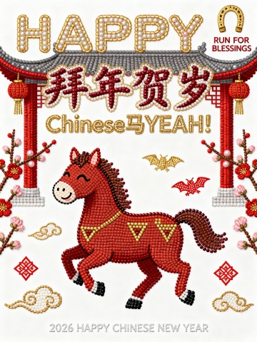 国潮风刺绣风格,以珠绣重拟物手法呈现卡通骏马,融合中式牌坊、灯笼与梅花元素,喜庆祥瑞,传递2026新春祝福。
