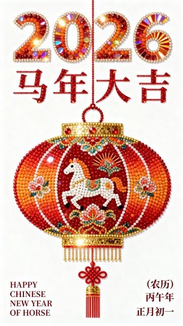 国潮风刺绣风格,重拟物设计,极繁主义呈现,红金主色,珠绣灯笼与马年元素结合,喜庆浓郁,中式民族感十足,农历丙午年春节贺图。