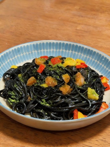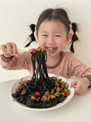 美食摄影风格,特写镜头,一只戴着面粉的手正抓起一把细长的生面条,面条自然垂落,面粉在黑色背景下飞扬,形成动态的白色粉末轨迹,大面积黑色留白背景,突出面条和手部的质感,光线从侧面打来,强调面条的纹理和面粉的颗粒感,画面简洁,主体突出,营造出专业、纯净的烹饪氛围。