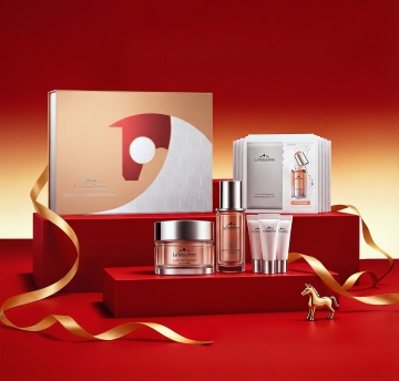 产品为主体,摆放白色石块做层次,把产品放在石块上,周围摆放白花,点缀绿色植物。
