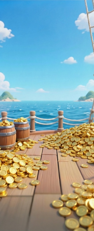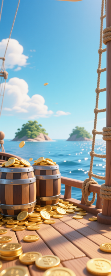 卡通感海盗湾,插画风椰树与宝藏箱,漫画风骷髅标志,欢乐冒险氛围。