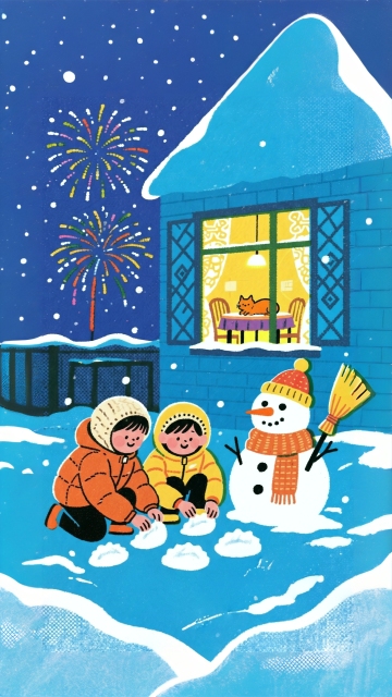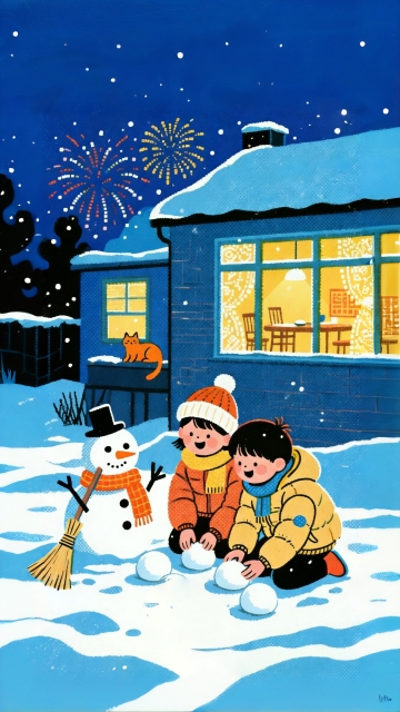 水彩风插画,拟人化雪人与孩童互动,温馨喜庆的除夕夜,窗内团圆包饺子,窗外烟花绽放,传递节日温暖。
