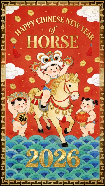 国潮风插画,鎏金浮雕质感骏马跃动,红金配色尽显喜庆奢华,中式古典元素融合现代设计。