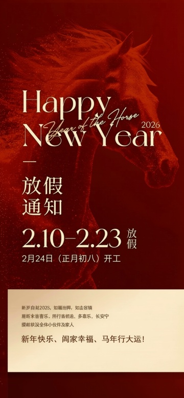 企业2026马年年会主题海报,深邃红色渐变背景,叠加微光粒子效果,左下角有抽象化的奔腾骏马,四蹄踏金色光浪奔腾向前,融入科技感光影线条,极简现代风格,兼具正式感与视觉冲击力,骏马象征企业开拓进取,光浪代表发展势能,红金配色传递庆典喜庆与商业高级感