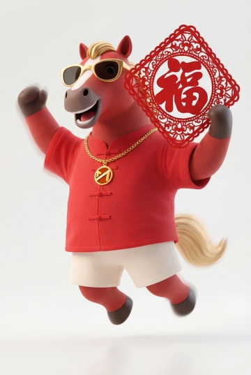 软3D风格拟人小马,身着国潮红金刺绣唐装,手持鎏金“福”字中国结,喜庆卡通感十足,传递新春祝福。