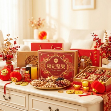 国潮风坚果礼盒,拟人化笑脸由坚果拼成,浮雕云纹点缀,喜庆红金配色,中式元素与现代创意融合,节日氛围浓厚。