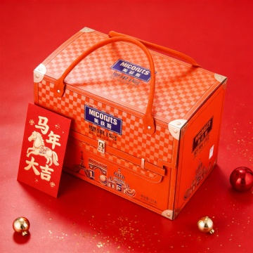 国潮风剪纸艺术融合鎏金元素,红金配色彰显喜庆与中式韵味,马年主题传递民族祝福,礼盒设计兼具传统美感与现代创意。