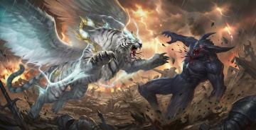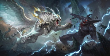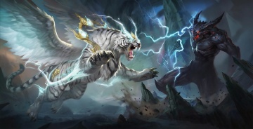 梦幻插画风,白虎展翅,电光环绕,超现实主义展现神圣与力量。
