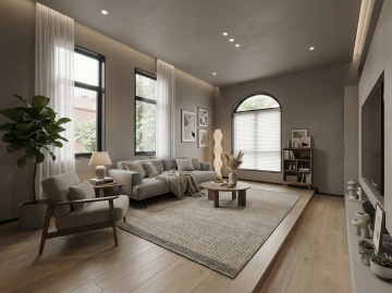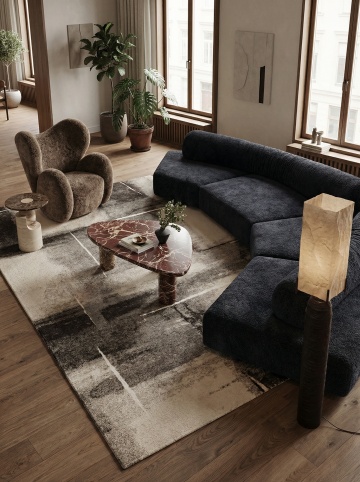 俯视角构图,极简主义风格客厅,整体以冷灰色、深靛蓝和哑光黑为主色调,营造出冷静克制的未来感氛围。傍晚时分,右侧墙面的悬浮式几何窗格精准切割着渐暗的天光,在深灰色微水泥地面投射出规则的菱形阴影图案。房间中央是一个模块化的深靛蓝色布艺转角沙发,表面呈现细腻的纹理褶皱,沙发上随意摆放着两个同色系但不同材质的靠垫——一个光滑如丝,一个粗粝似麻。沙发前是一块超大尺寸的浅灰色羊毛地毯,边缘故意做旧处理,地毯中央悬浮着一个由哑光黑金属框架支撑的透明亚克力茶几,茶几上放置着一个极简线条的黑色陶瓷花瓶,里面插着三支干枯的黑色芦苇。沙发左侧墙角矗立着一盆形态遒劲的琴叶榕,深绿色叶片在冷光下呈现出近乎黑色的剪影,种植在一个带有细微凹痕的手工浇筑混凝土花盆中。沙发背景墙采用了深浅不一的灰色渐变处理,中央悬挂着一幅无框的几何抽象画,画面由精确的黑色直线和大小不一的白色方块构成,画作下方是一个悬浮式的黑色橡木电视柜,表面只放置了一个造型极简的白色音响。天花板采用无主灯设计,而是在不同区域嵌入了可调节角度的线性LED灯带,光线均匀地漫射在整个空间,强调出墙面的微妙肌理和家具的利落线条。地面采用600×600mm的深灰色哑光瓷砖,以30度角错位拼接,缝隙间填充同色系美缝剂,形成整体感极强的视觉平面。整个空间布局遵循"少即是多"的原则,每一件家具都经过精心挑选,线条锐利如刀锋,光影层次分明,呈现出一种冷静而富有力量的空间美学。