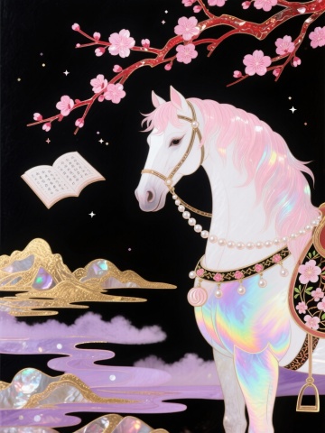工笔风白骏立于墨色山水间,鎏金饰带缀以珍珠,幻彩肌理流转,花枝繁盛,刺绣质感与国潮元素交织,尽显奢华、唯美的中式梦幻意境。
