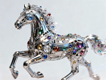 未来感与科技感交融的3D金属骏马,镶嵌璀璨宝石,重拟物风设计尽显奢华梦幻,虚拟现实美学再现机械与诗意的完美共生。