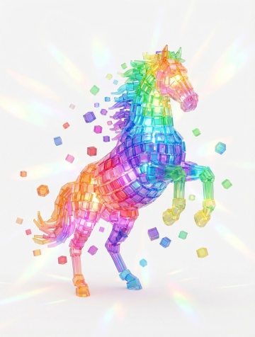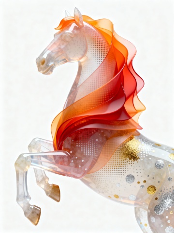 未来感与科技感交融的3D玻璃马,流光溢彩的液态鬃毛如梦幻般飘逸,清透质感中点缀金银粒子,优雅呈现虚拟现实之美。